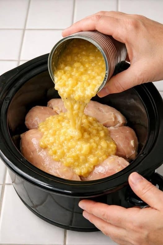 This slow cooker 4-ingredient Amish Chicken Corn Noodle is the kind of no-fuss, stick-to-your-ribs meal that has fed farm families for generations. You simply lay the raw chicken breasts in the slow cooker, dump cream style corn over the top, add just two more pantry staples, and let it putter away all afternoon. By suppertime, you’ve got tender chicken, a creamy corn gravy, and soft noodles that taste like something Grandma would’ve served after a long day in the fields.
