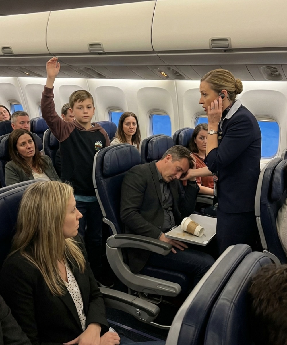 A flight attendant—Emily, her name badge slightly crooked—rushes down the aisle. She drops to her knees, checks his neck, then his wrist. Her training takes over, but her face gives her away.