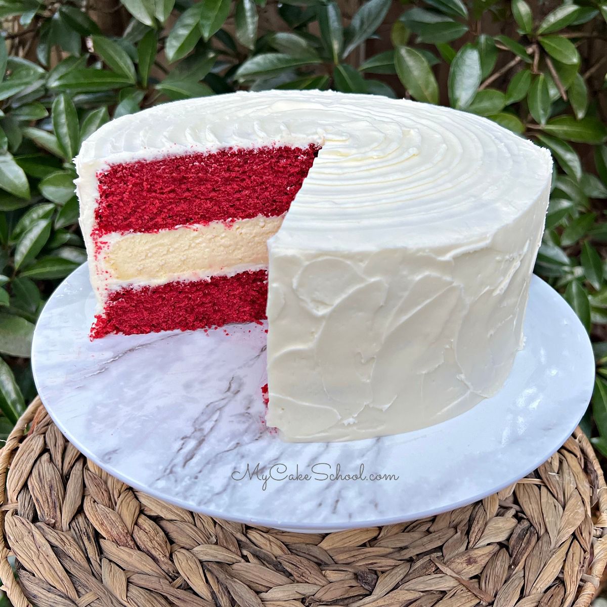 A layer of cheesecake is sandwiched between two moist red velvet cake layers and frosted with cream cheese frosting in this impressive, elegant dessert!