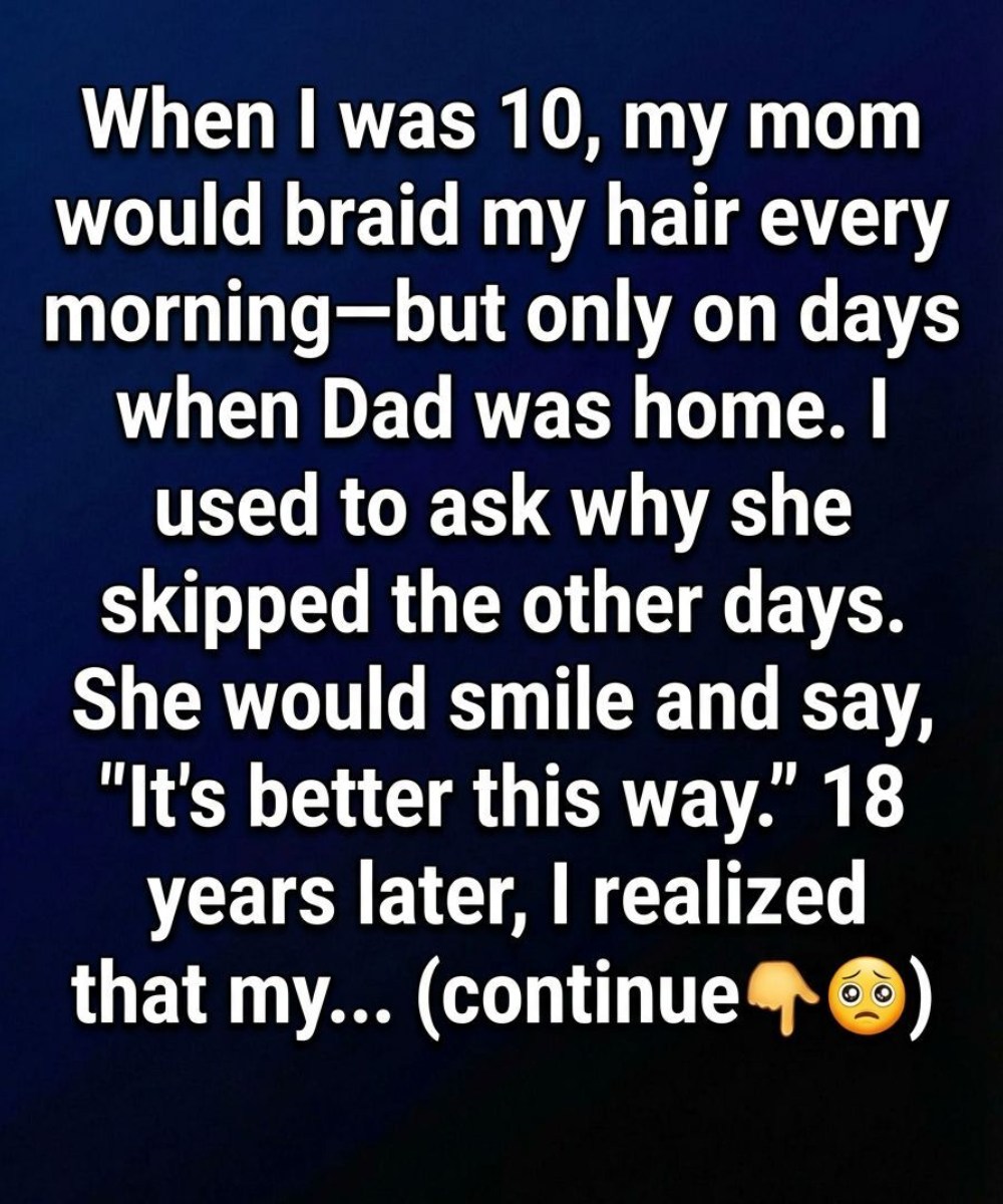 She smiled at first, then fell silent. After a moment, she explained that my father—kind in his own way—believed order and presentation were important, and he expected the household, including me, to reflect that. On the days he was home, she woke up earlier to braid my hair so mornings wouldn’t turn tense or difficult. When he was away, she allowed herself—and me—more freedom and a slower pace.