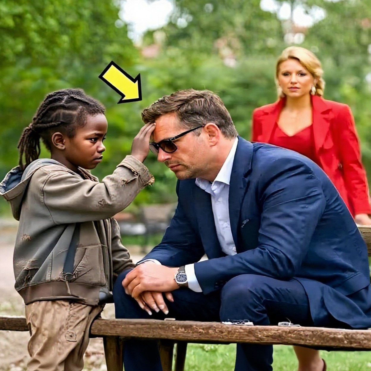 He turned as the clatter of heels sounded behind them. His wife stood there, impeccable, trembling, her sunglasses failing to hide the panic in her eyes.